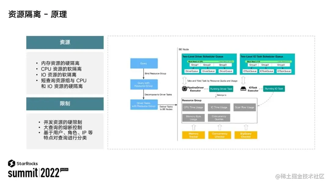 上图展示的是 StarRocks 资源隔离运行的机制。StarRocks 内部会给资源组划分固定的资源,包括 CPU内存、IO 等等。有些资源是软隔离,比如 CPU、IO,有些资源是硬隔离,所谓的硬隔离超过了就要失败,比如内存。除了资源分配以外,StarRocks 也支持为每个资源组设定一定的限制,对于超过限制的请求就会予以拒绝。比如每个资源组都会有最大的请求并发数,当请求的并发超过限制时,新的请求就会被资源组拒绝掉。