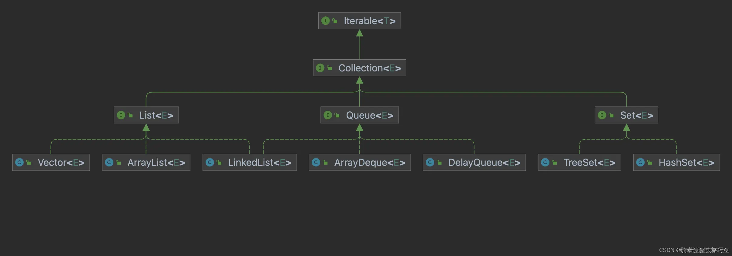 以上是一个简单的类图,从图中可以看出Collection是众多集合类的根接口(当然它之上还有Iterable接口),在JDK中不提供这个接口的任何直接实现:而是提供了更具体的子接口(如 List、Queue和Set)的实现。