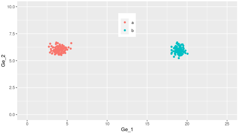 利用ggplot函数作图,数据为c2data,此时能显示出Ge1和Ge2的分布情况,可以看出在Ge_1(x轴)上分成了两类,而Ge_2上分类趋势很小(因为Ge_2本身就没什么差异分组)