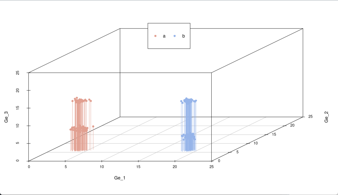 刚刚是两个基因,现在再加一个Ge_3,这个基因的表达量差异设置的更大一些,设置该基因分成两个组,而且每个组的表达量也存在两种类型,所以这个基因对样本分类的作用更大。