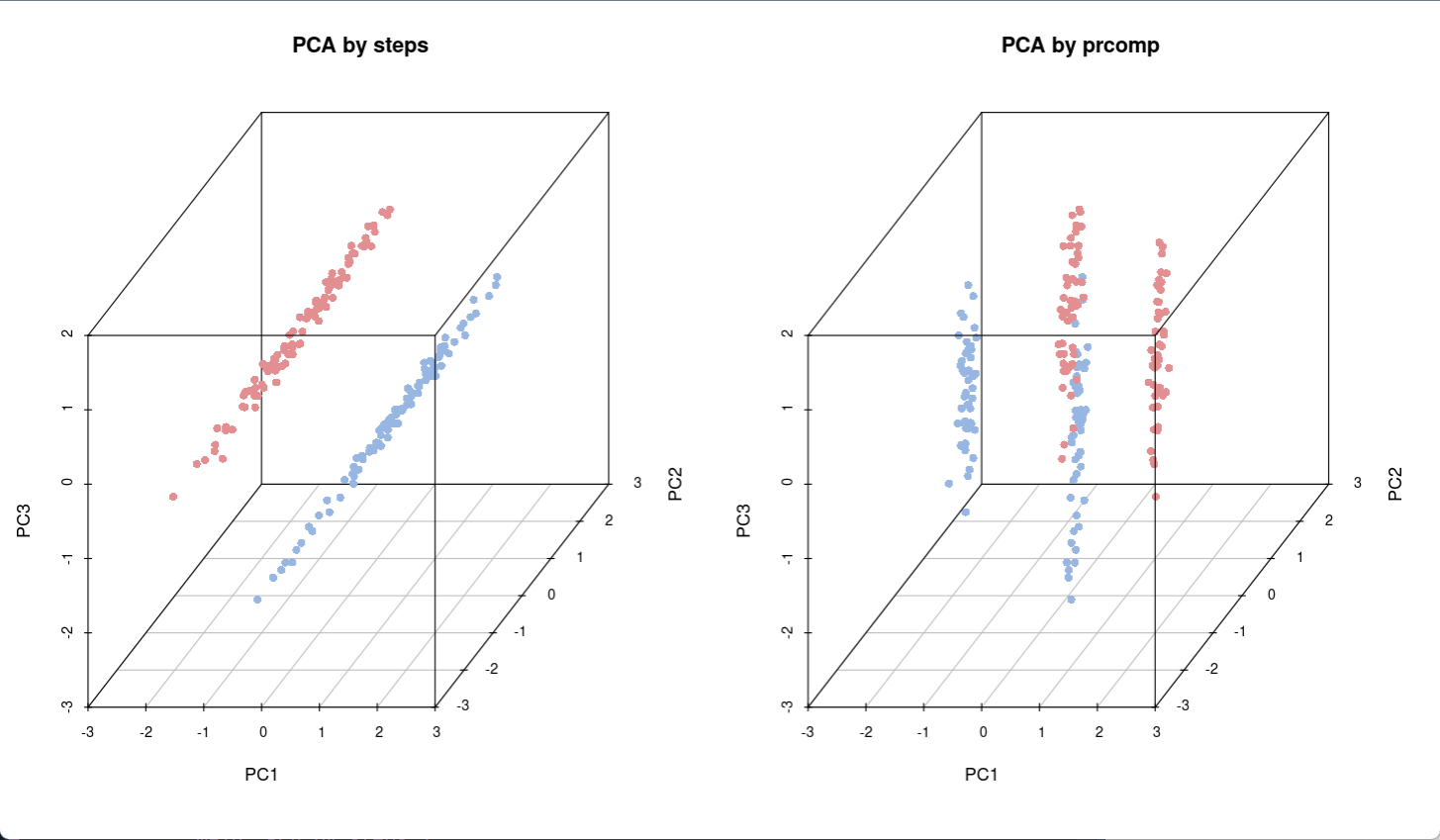 接下来,比较两种方式实现PCA分析的结果差异,左图是手动方式,右图是利用prcomp方式,可以看出两种结果具有差异性。