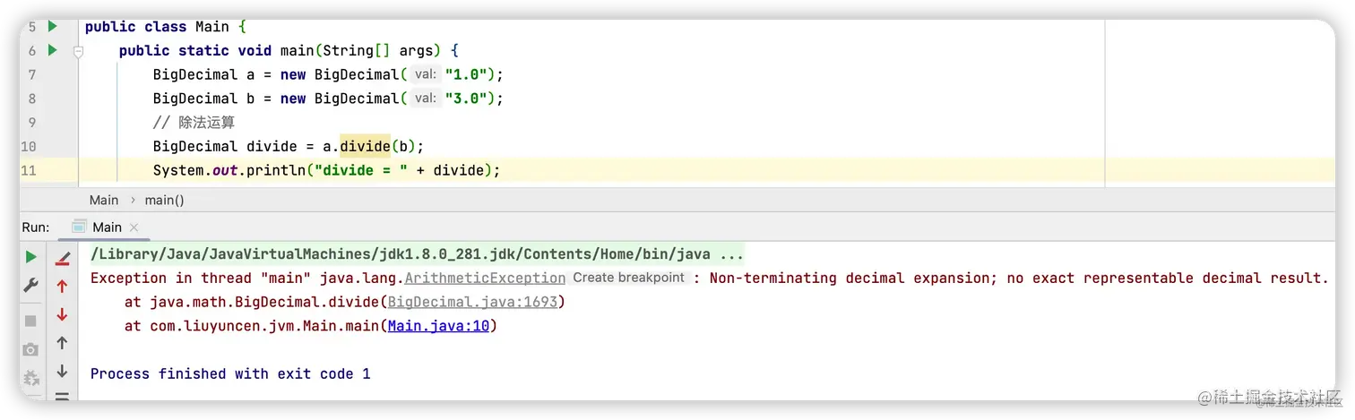 大概的意思是,BigDecimal 想返回一个精确的数字,但你 1/3 让人家咋返回精确数,人家就只能给你抛出一个友谊的提示了!