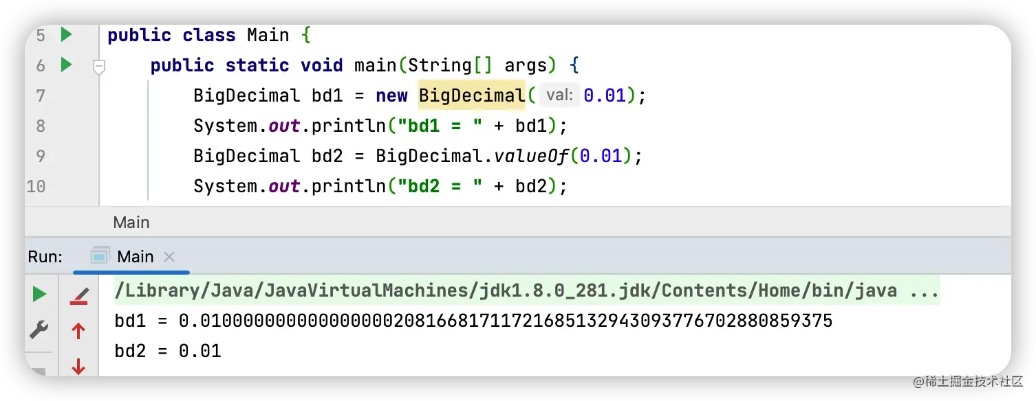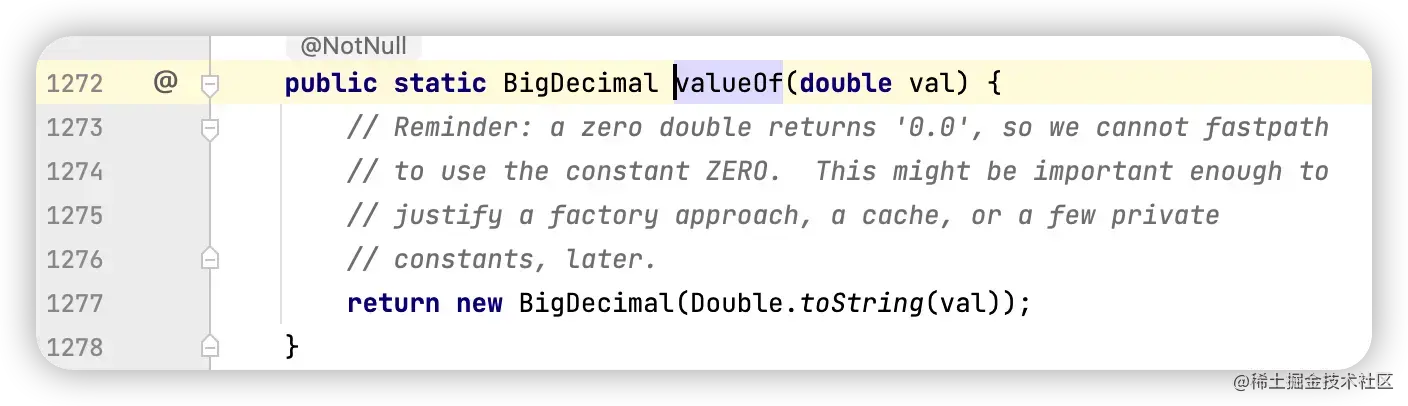 造成这种差异的原因是 0.1 这个数字计算机是无法精确表示的,送给 BigDecimal 的时候就已经丢精度了,而 BigDecimal.valueOf 的实现却完全不同。