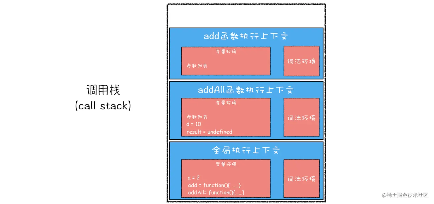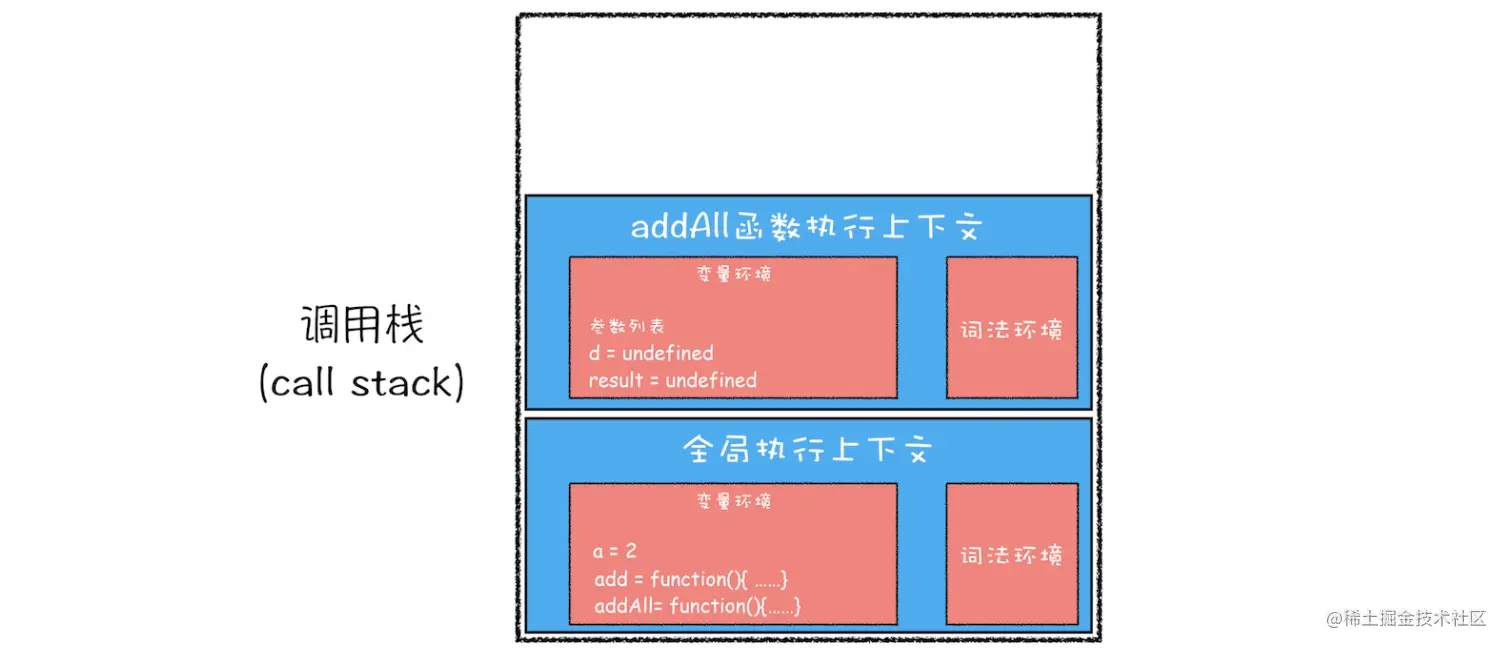 4、进入了函数代码的执行阶段,这里先执行的是 d=10 的赋值操作,addAll 函数执行上下文中的 d 由 undefined 变成了 10;