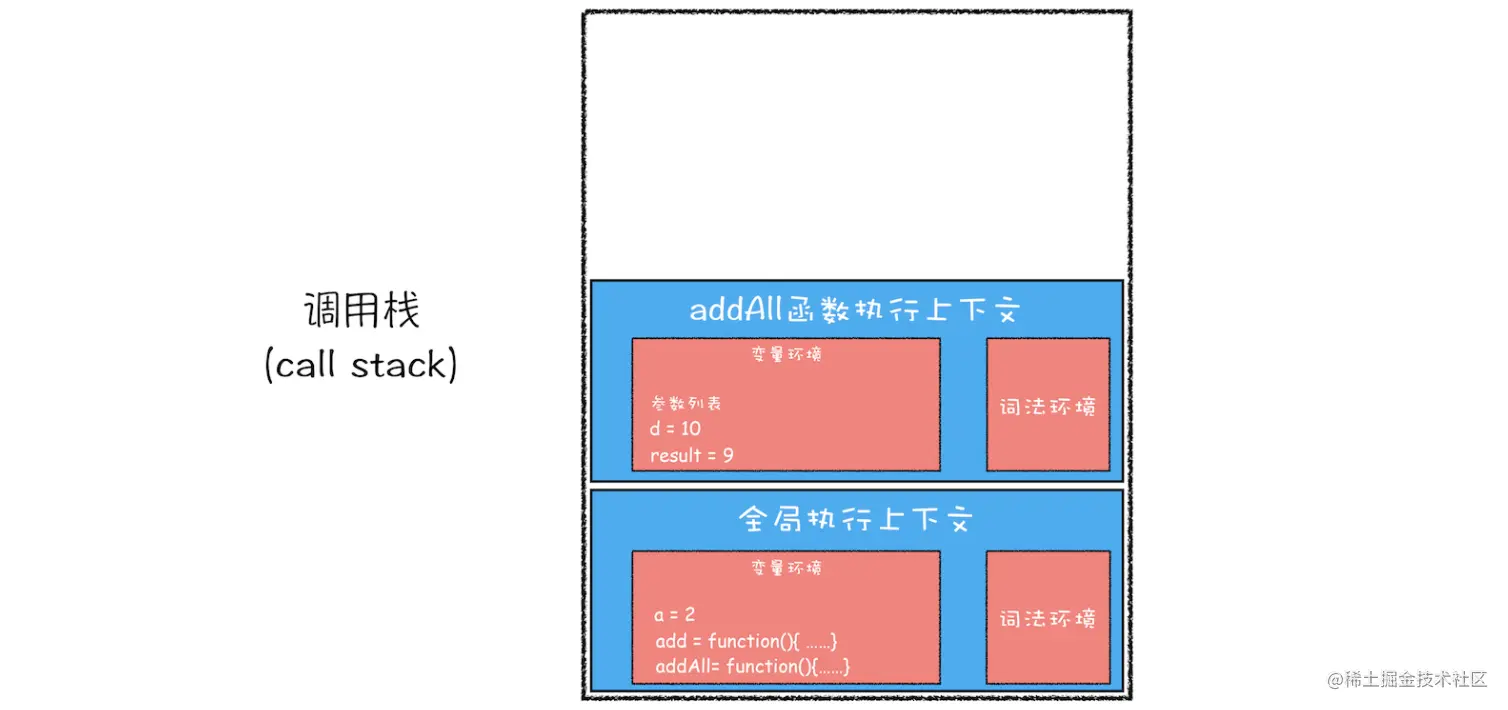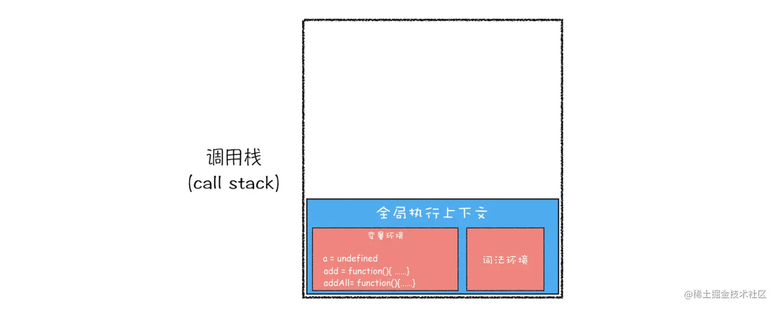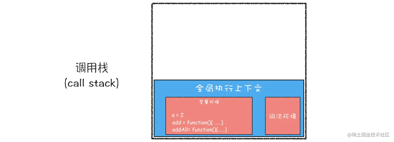 注意:只有当整个应用程序结束的时候,调用栈才会被清空,所以程序结束之前, 调用栈最底部永远有个全局执行上下文。