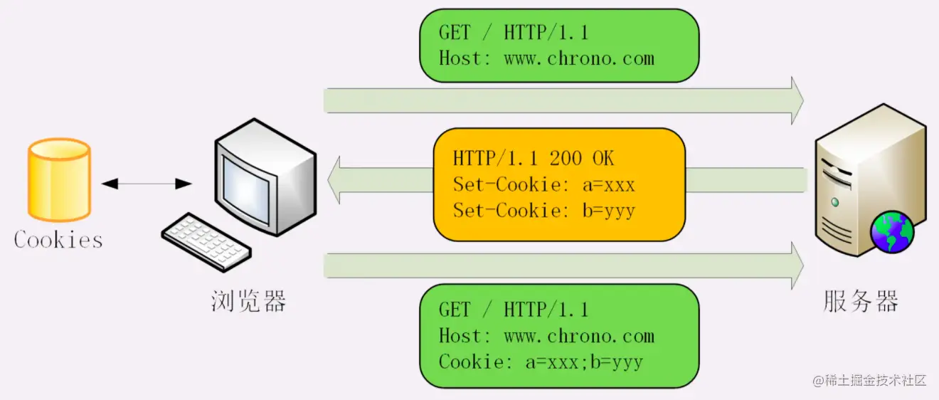 Cookie 是由浏览器负责存储的,而不是操作系统。所以,它是“浏览器绑定”的,只能在本浏览器内生效;它的工作需要用到两个头字段: