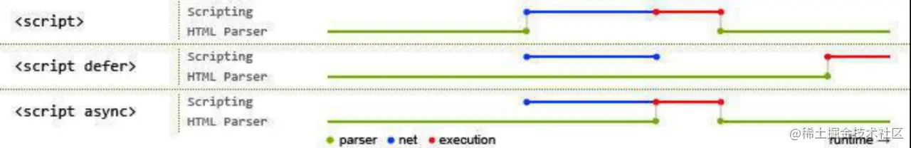 - 在不加defer和async的情况下,js的加载和执行都会阻断html的解析。即js文件的加载、执行和html解析是同步进行的。