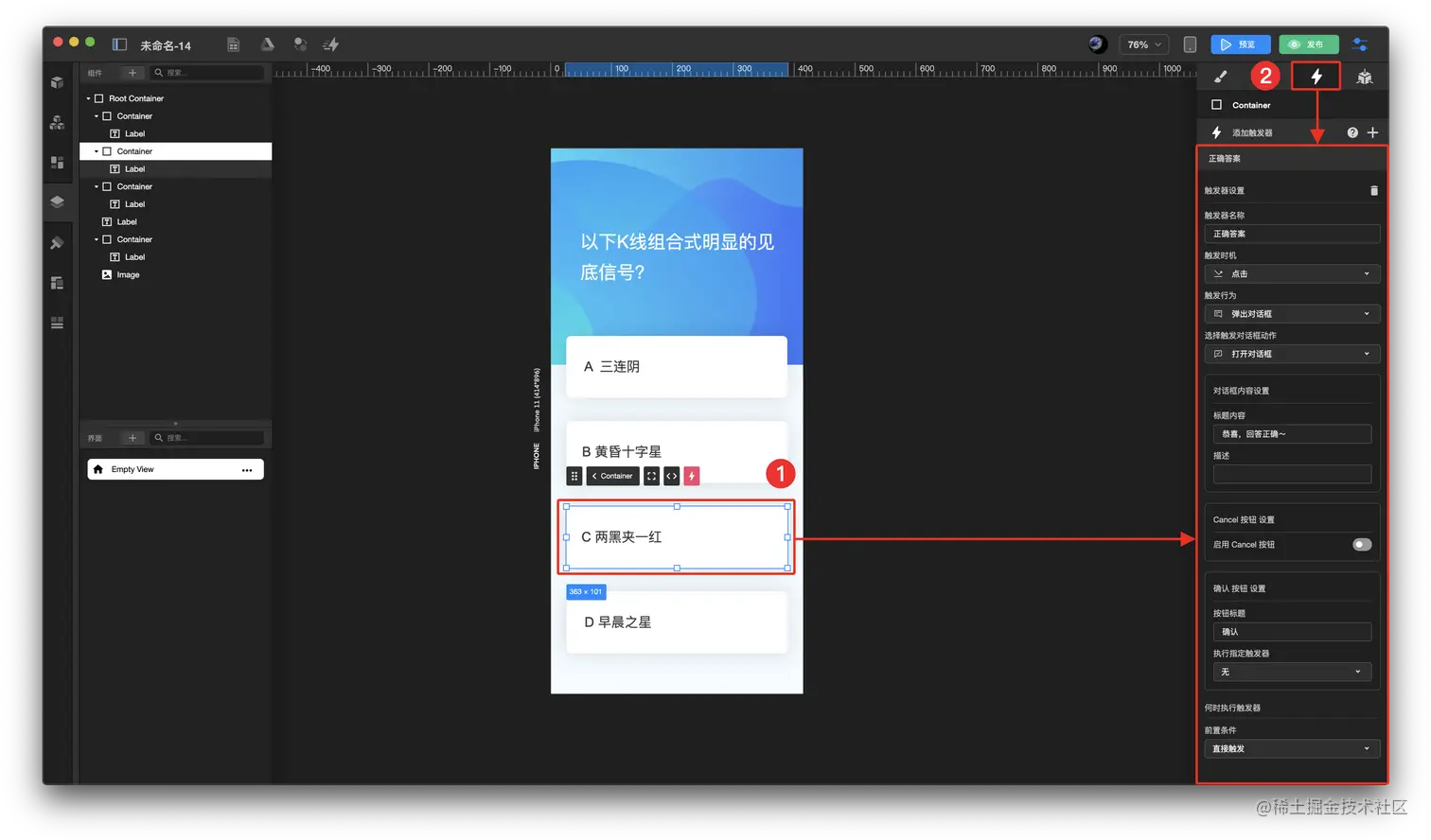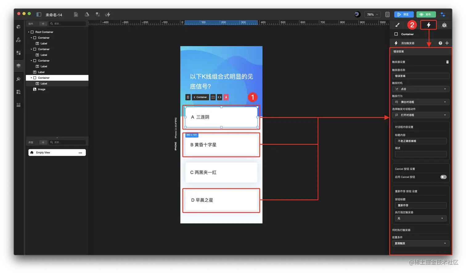 如何制作知识问答页面 TOWIFY 2022-11-03 134 阅读1分钟 效果展示: 前置准备: 搭建完成带配置触发器的页面 具体步骤: 配置错误答案触发器 配置正确答案触发器 步骤分解: 配置错误答案触发器 选中错误答案 容器 在右侧上方面板 触发器 中添加错误答案触发器,并进行数据配置 配置正确答案触发器 选中正确答案 容器 在右侧上方面板 触发器 中添加正确答案触发器,并进行数据配置