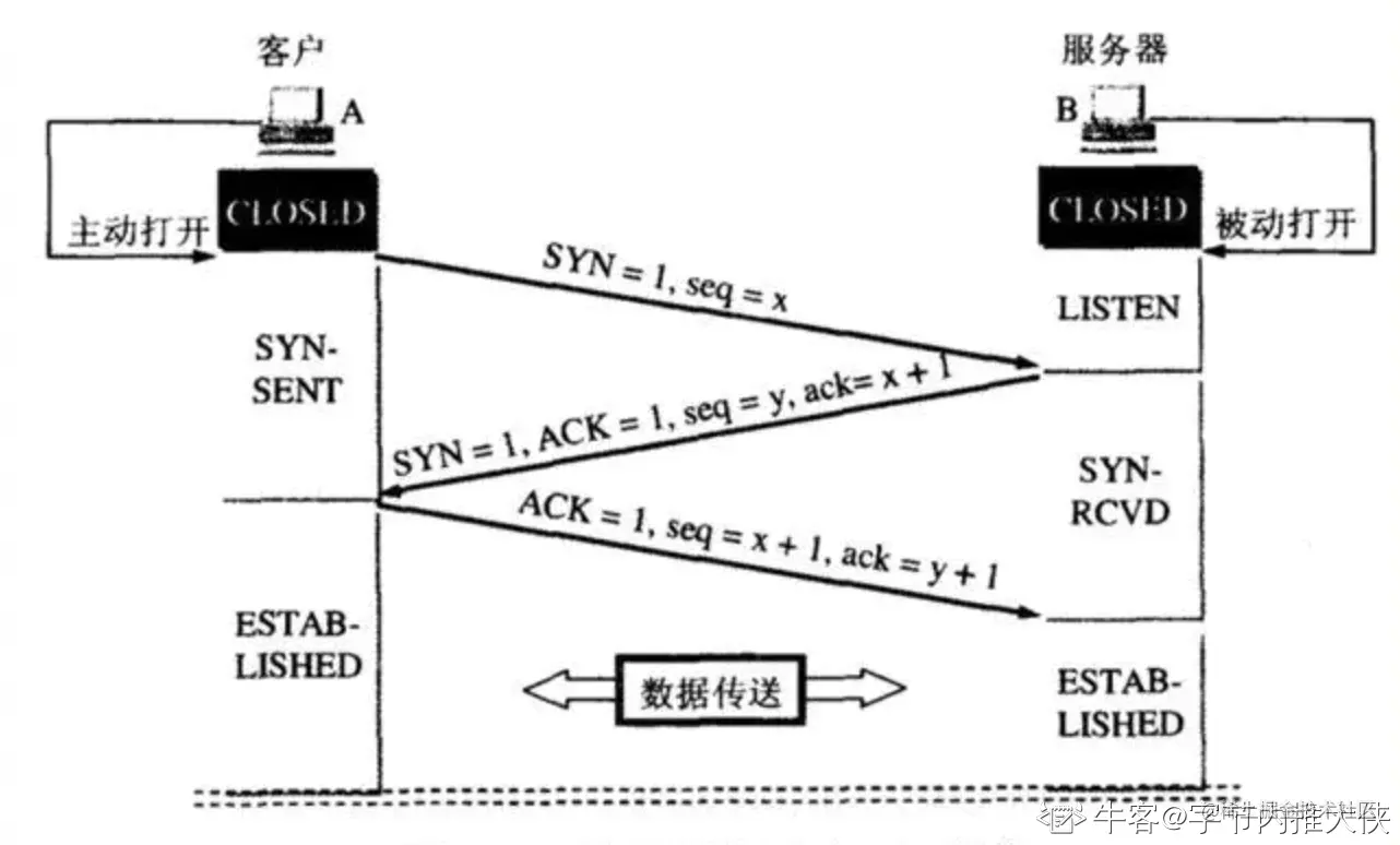 - 第三次握手:客户端收到服务端发来的报文后,会再向服务端发送报文,其中包含标志位ACK=1,序列号seq=x+1,确认号ack=y+1。第三次握手前客户端的状态为SYN-SENT,第三次握手后客户端和服务端的状态都为ESTABLISHED。此时连接建立完成。