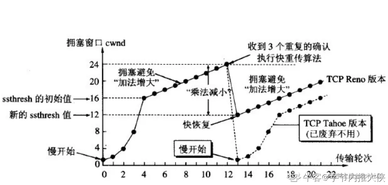 在采用快恢复算法时,慢开始算法只是在TCP连接建立时和网络出现超时时才使用。 采用这样的拥塞控制方法使得TCP的性能有明显的改进。