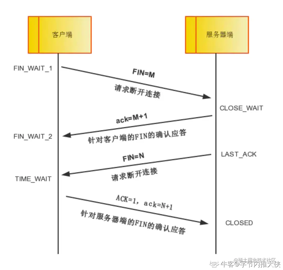 - A的应用进程先向其TCP发出连接释放报文段(FIN=1,seq=u),并停止再发送数据,主动关闭TCP连接,进入FIN-WAIT-1(终止等待1)状态,等待B的确认。
