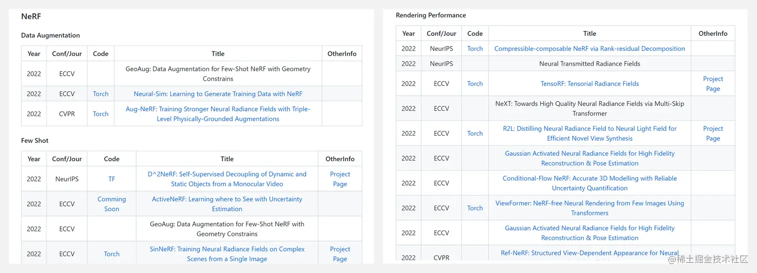 这是一份精选的神经辐射场 (NeRF) 论文列表。所有论文都根据关键字/任务分组,并按年份排序。汇总包含以下主题,希望这篇可以帮助有兴趣进行 NeRF 相关研究的同行: