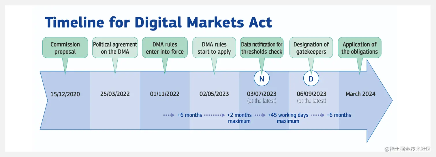 11 月 1 日,欧盟的《Digital Markets Act (数字市场法)》开始生效,要求占主导地位的平台让较小的竞争对手进入,并且迫使 WhatsApp 接收来自 Signal 或 Telegram 等竞争应用程序的消息,或者阻止亚马逊、苹果、谷歌优先使用他们自己的应用程序和服务。