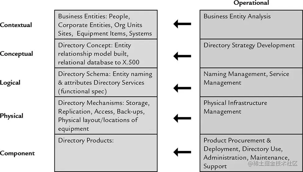 总的来说是三个阶段(Phase),六个层级(Layer)。三个阶段是策略/计划->设计->运营。六个阶段分别为: