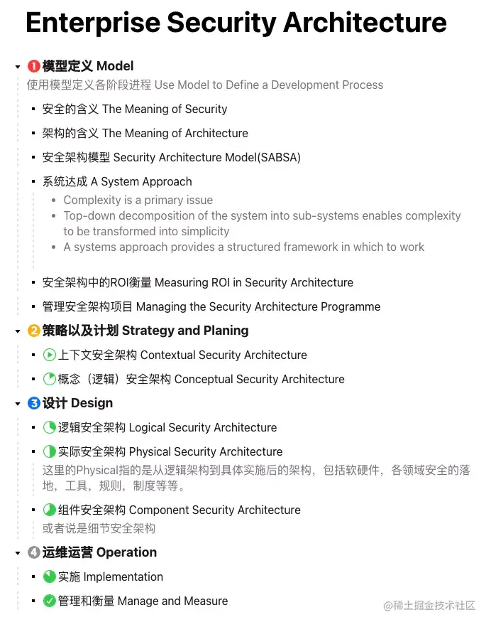 早在5月份的时候就已经决定去新开几篇安全架构的文章,不过后来却只写一小部分。因为长进有限,外加上沉淀不足,思路受阻至今。直到最近,感觉七七八八学习了不少,翻翻《Enterprise Security Architecture》发现已经看了几个月了。遂将笔记整理成文。