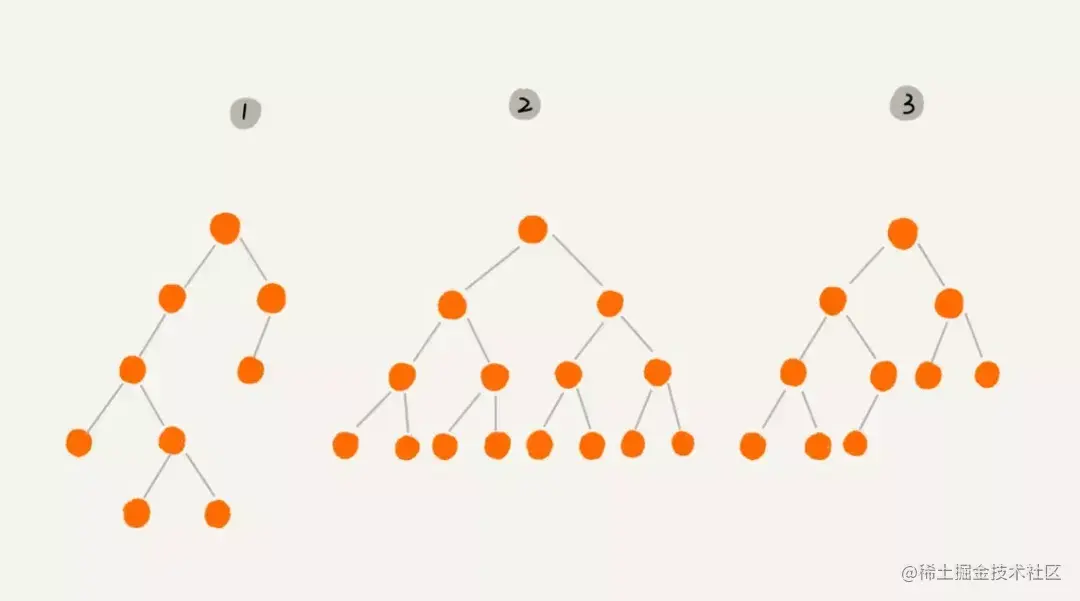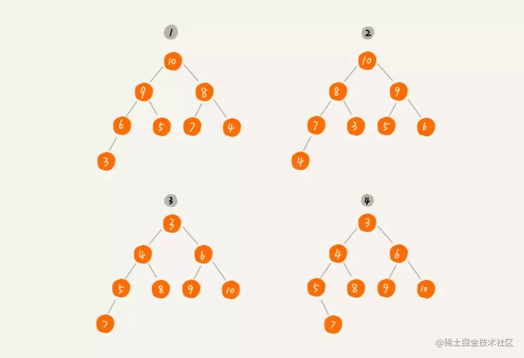 其中 1、2 为大顶堆,3 为小顶堆,4 不是堆(不是完全二叉树)。