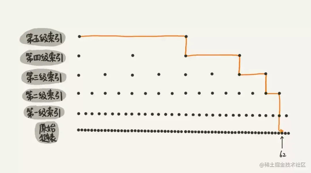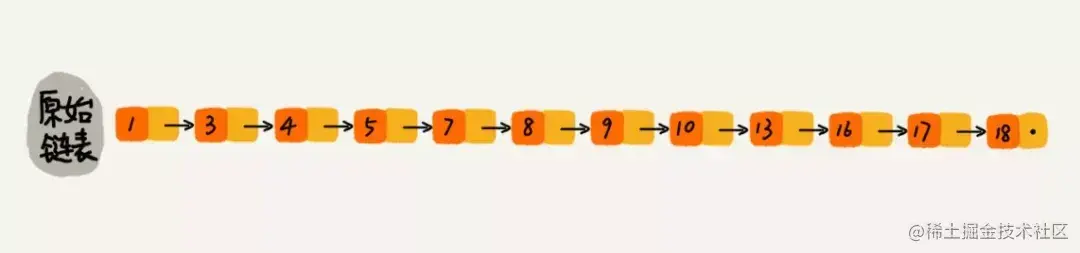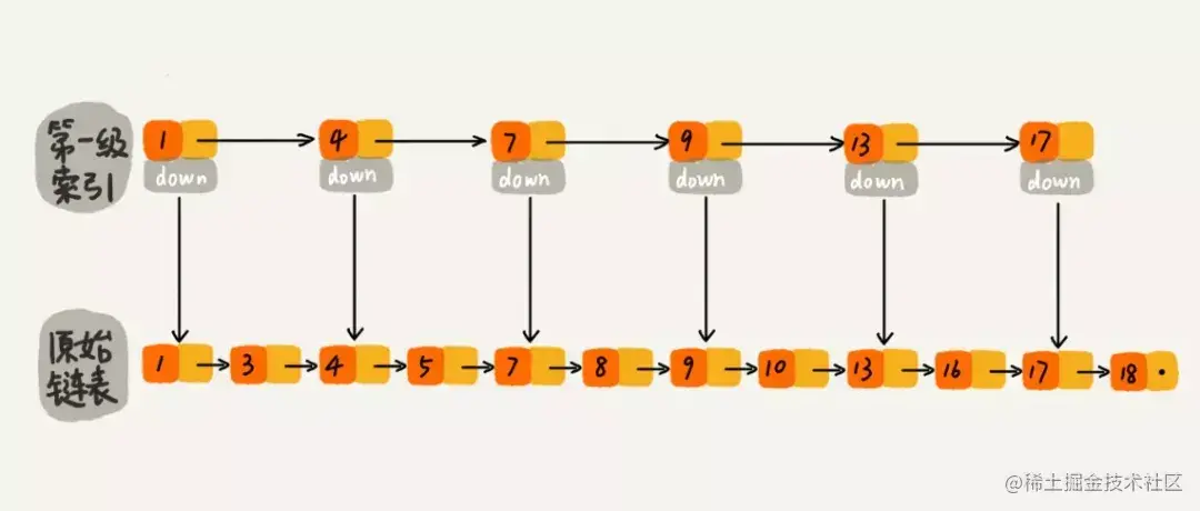 由于它的内存空间非连续,因此查找某个元素时只能从头到尾遍历,时间复杂度为 O(n)。 那么能不能提高链表的查找效率呢?