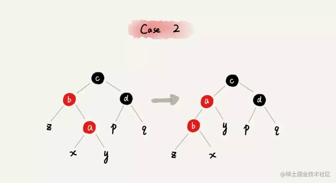关注节点是 a,它的叔叔节点 d 是黑色,a 是其父节点 b 的右子节点。则进行如下操作: