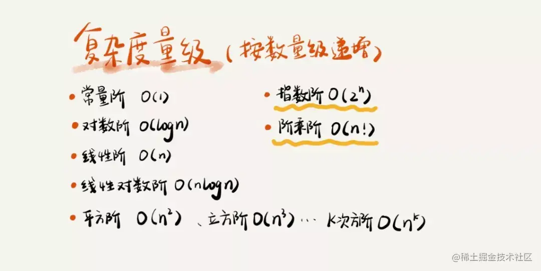 用什么来衡量呢?就是用复杂度来,包括时间复杂度和空间复杂度,通常用大 O 复杂度表示法。