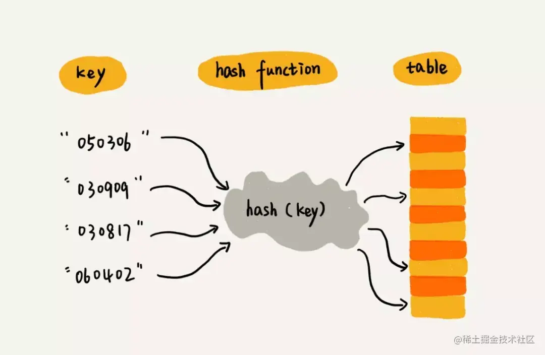 其中的 key 为可理解为要存入的数据的键(键-值对形式);hash() 是「散列函数」,它根据 key 计算得到一个非负整数,是哈希表实现的一个关键点;table 为存放数据的数组。