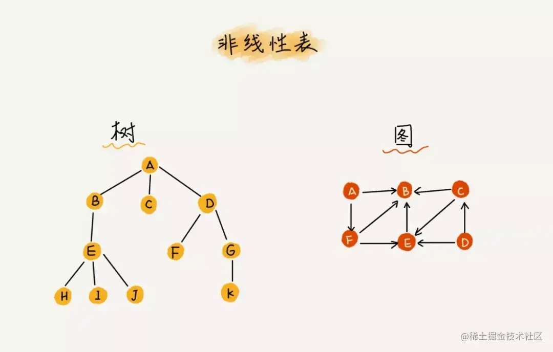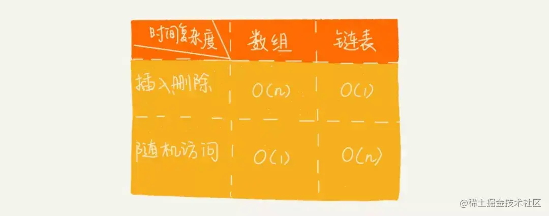 随机访问(下标访问):数组支持随机访问,随机访问的时间复杂度为 O(1) ;链表不支持随机访问,时间复杂度为 O(n) ;