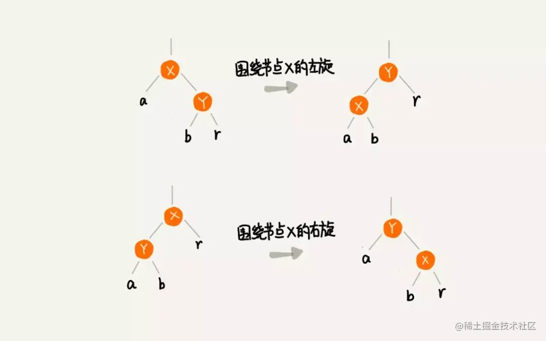 平衡性调整操作主要包括旋转(结构调整)和着色(红黑转换),其中旋转又分为左旋(rotate left)和右旋(rotate right)两个操作,左旋指的是围绕某个节点的左旋,右旋同理。左旋和右旋的操作示意图如下: