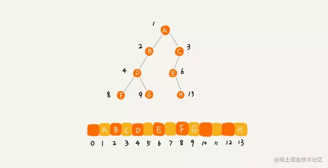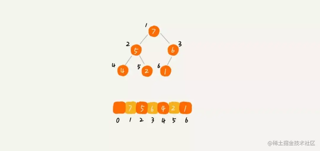 前面分析了二叉树的存储方法有两种:链式存储和顺序存储,而顺序存储比较适合完全二叉树。堆的顺序存储示例如下: