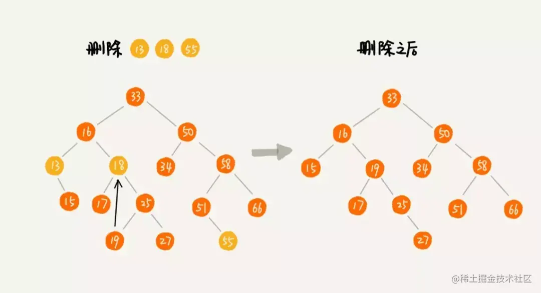3. 待删除的结点有两个子节点:需要先找到待删除节点的右子树中的最小节点,用它替换要删除的节点,然后再删除该最小节点(下图的节点 18)。