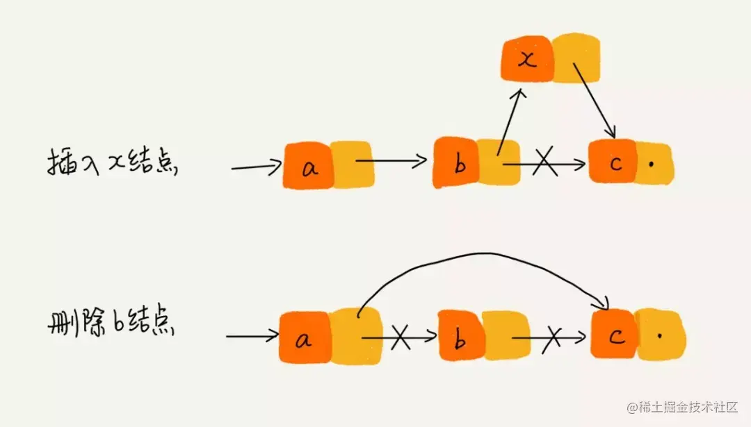 插入数据:由于数组内存空间连续,在数组指定位置插入元素时需要做数据搬移,时间复杂度为 O(n) ;链表则直接插入即可,时间复杂度为 O(1) 。