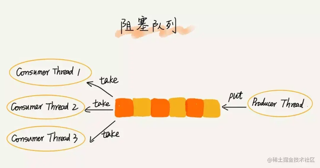 “生产者-消费者”模型。即队列的两端分别对应生产者和消费者,队列满的时候,生产者阻塞等待;队列空的时候,消费者阻塞等待。示意图: