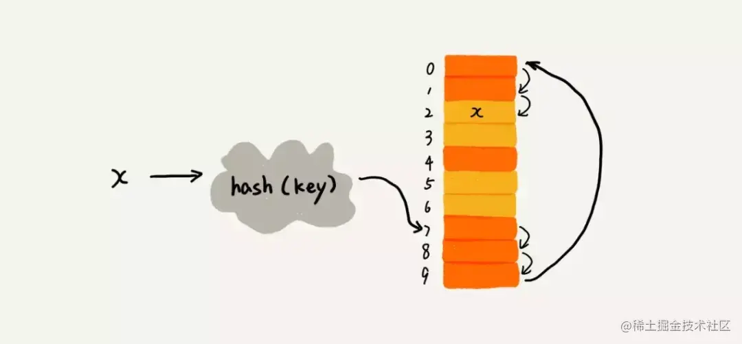 往散列表中插入数据时,若某个数据经散列函数散列之后,存储位置已经被占用,就从当前位置开始依次往后查找,直到找到空闲位置插入。示意图: