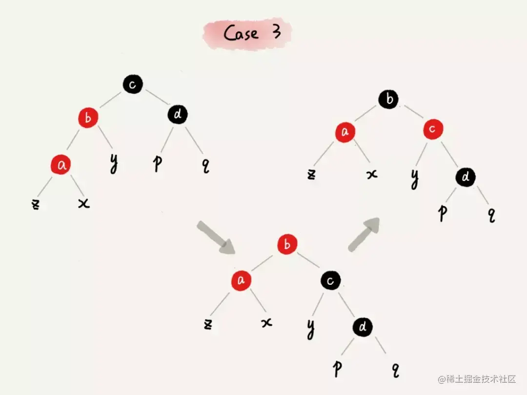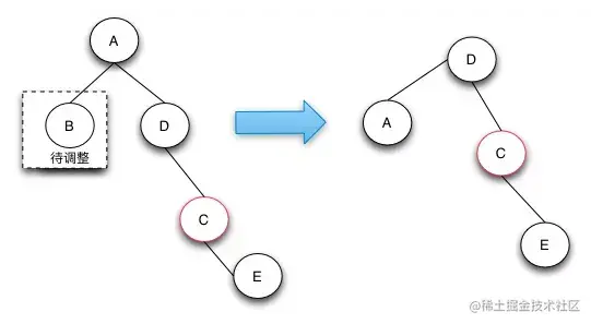 待调整节点的兄弟节点是黑色,且右子节点是红色、左子节点是黑色(兄弟节点在右边的情况。若兄弟节点在左边,就是左子节点是红色、右子节点是黑色)。则进行如下操作: