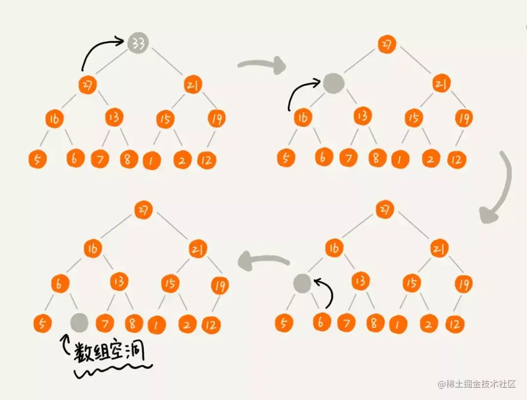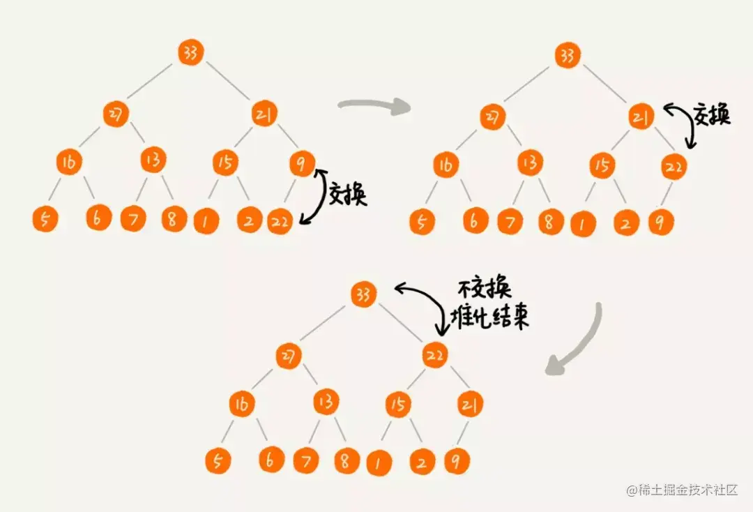 如果转换思路,把最后一个节点放到堆顶,然后再进行从上到下堆化,如图所示: