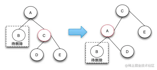 2. 待删除的节点有一个子节点:将待删除节点的父节点指向待删除节点的子节点(下图的节点 13);