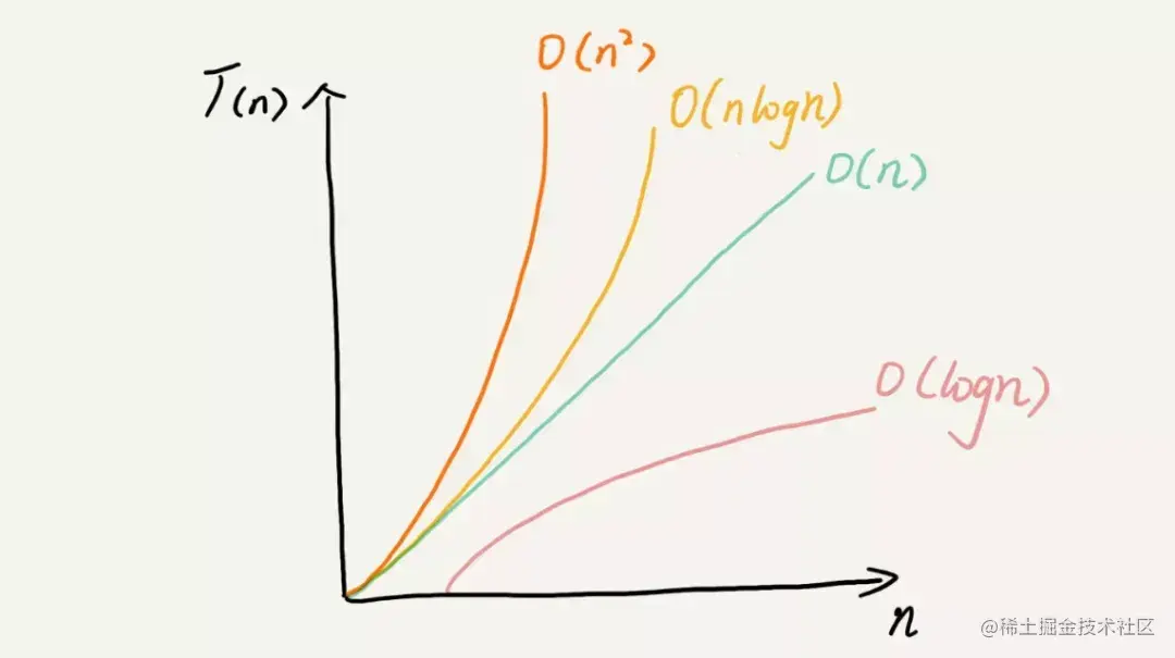 时间复杂度:并非具体表示代码真正的执行时间,而是表示代码执行时间随数据规模增长的「变化趋势」,因此也叫渐进时间复杂度(asymptotic time complexity),简称时间复杂度。