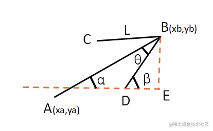 箭头由三条线段组成,AB线条好画,主要在于C,D的坐标我们要如何计算呢。有两个方案,根据线段确定和根据夹角确定,下面的代码是根据夹角进行计算的。