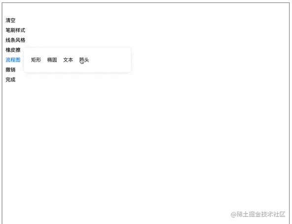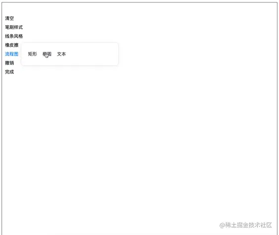 看下效果,能够正常的展示矩形图,线条等设置,也能够正常的撤销,但是看起来怪怪的,因为不清楚自己的矩形在挪动的过程中到底画了多大,当前样式是什么,我们在移动过程中加上中间态的展示,思路是在body下增加一个dom节点,初始位置top是鼠标的left值,left值是鼠标的top值,然后宽高根据鼠标移动的位置进行绝对值计算,不要忘了将翻转原点设为top,left,当鼠标后续x位置比初始位置小,需要将图像沿y轴反转,y轴位置比初始位置小的时候沿x轴反转。