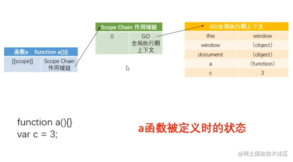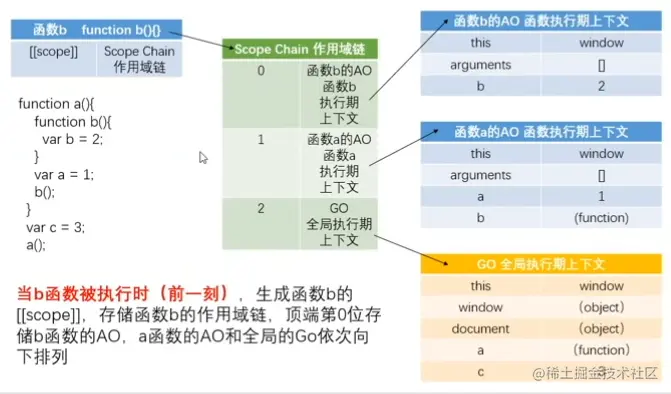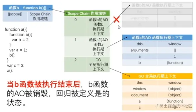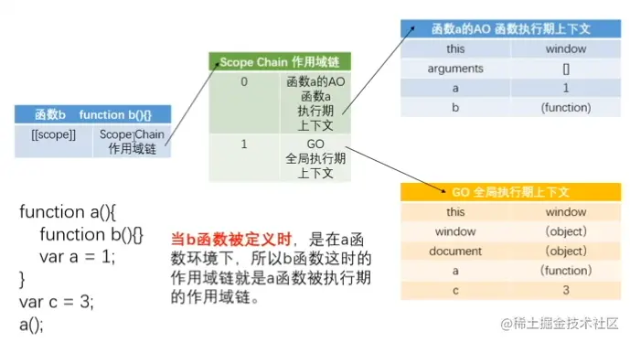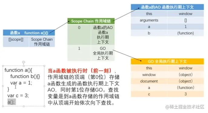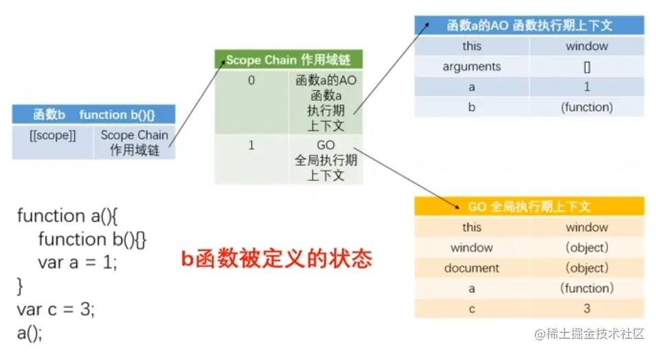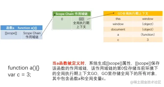 - 当函数被定义的时候,已经形成作用域([[scope]]),已经形成作用域链:scope chain,作用域链里面已经存在GO了,在函数执行前一刻生成自己的AO;