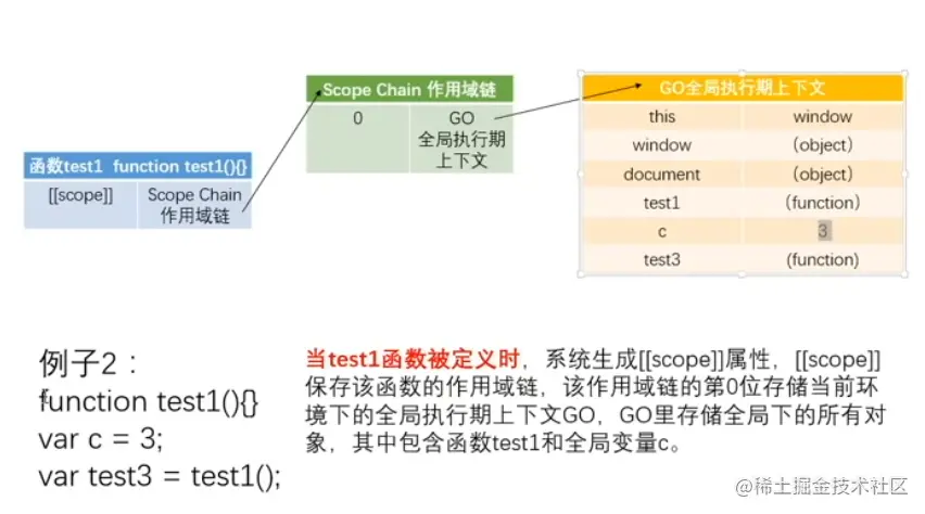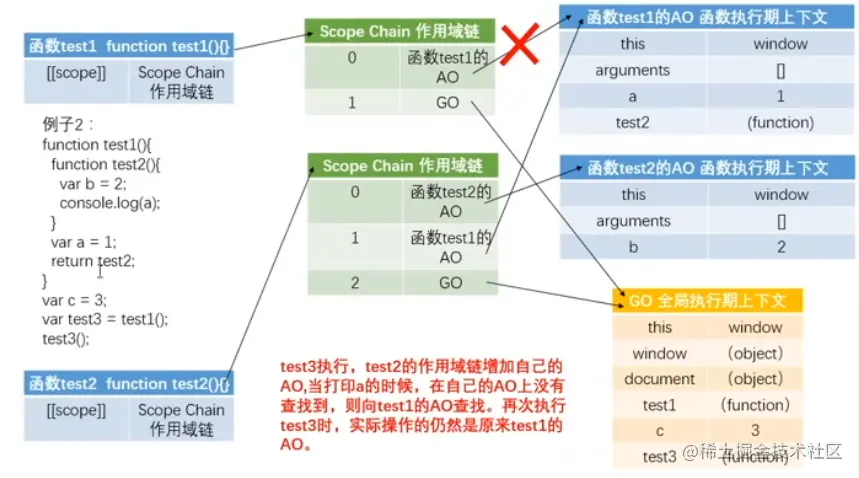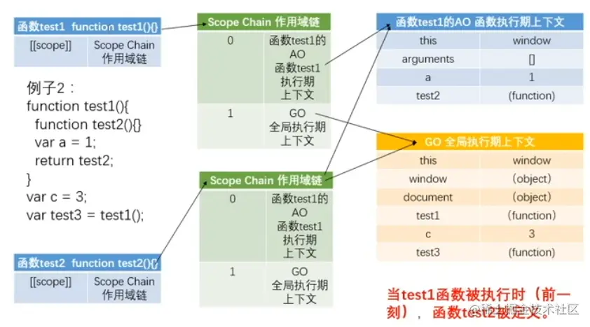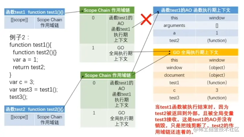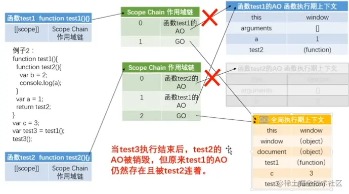 // test3()执行完后,test1()的AO是要销毁的,但是test2()被保存到全局下,
