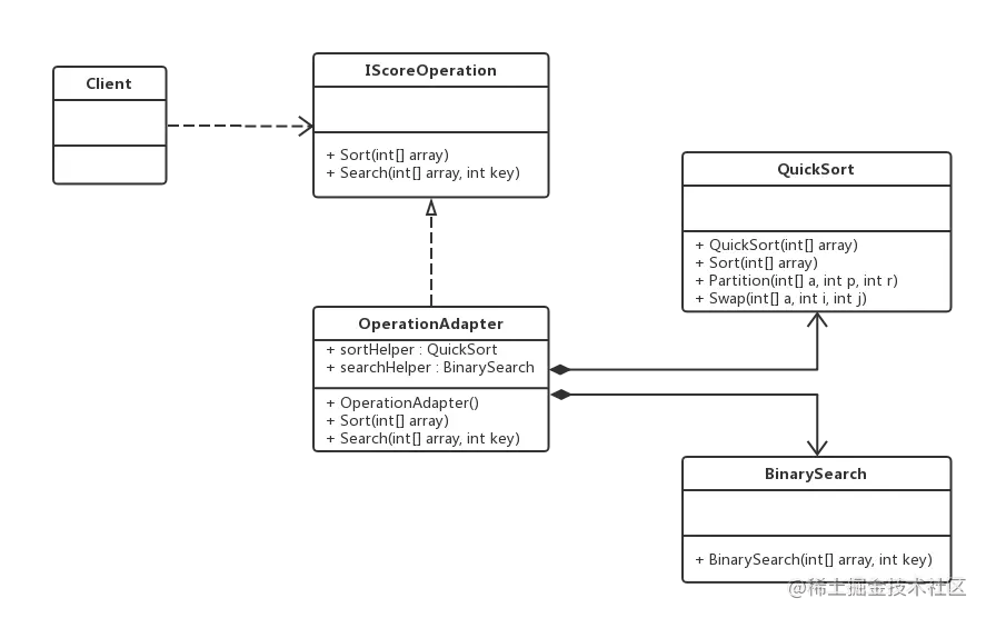 其中,IScoreOpertion接口充当抽象目标,QuickSort和BinarySearch类充当适配者,而OperationAdapter充当适配器。