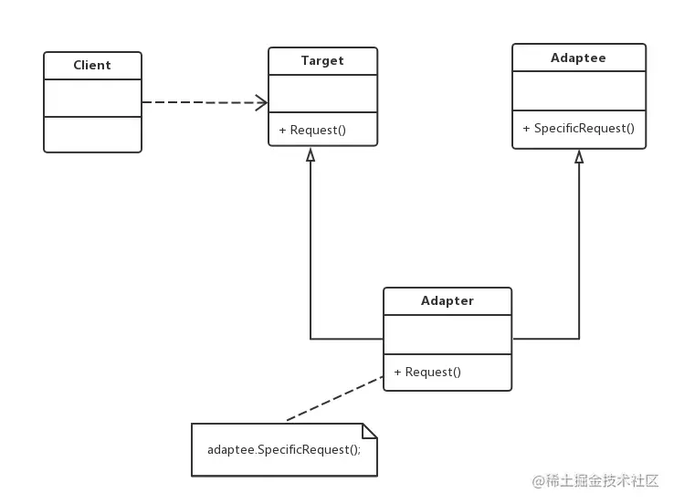 (2)Adapter(适配器类):适配器可以调用另一个接口,作为一个转换器,对Adaptee和Target进行适配。适配器类是适配者模式的核心,在适配器模式中,它通过继承Target并关联一个Adaptee对象使二者产生联系。
