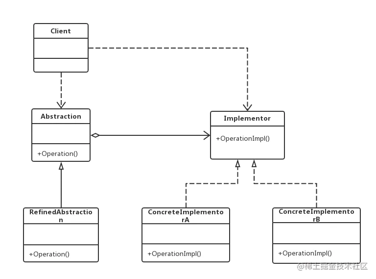 (3)Implementor(实现类接口):定义实现类的接口,一般而言,它不与Abstraction的接口一致。它只提供基本操作,而Abstraction定义的接口可能会做更多更复杂的操作。