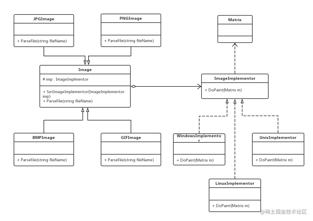 M公司开发部想要开发一个跨平台的图像浏览系统,要求该系统能够显示JPG、BMP、GIF、PNG等多种格式的文件,并且能够在Windows、Linux以及Unix等多个操作系统上运行。该系统首先将各种格式的文件解析为像素矩阵(Matrix),然后将像素矩阵显示在屏幕上,在不同的操作系统中可以调用不同的绘制函数来绘制像素矩阵。该系统需要具备较好的扩展性以支持新的文件格式和操作系统。