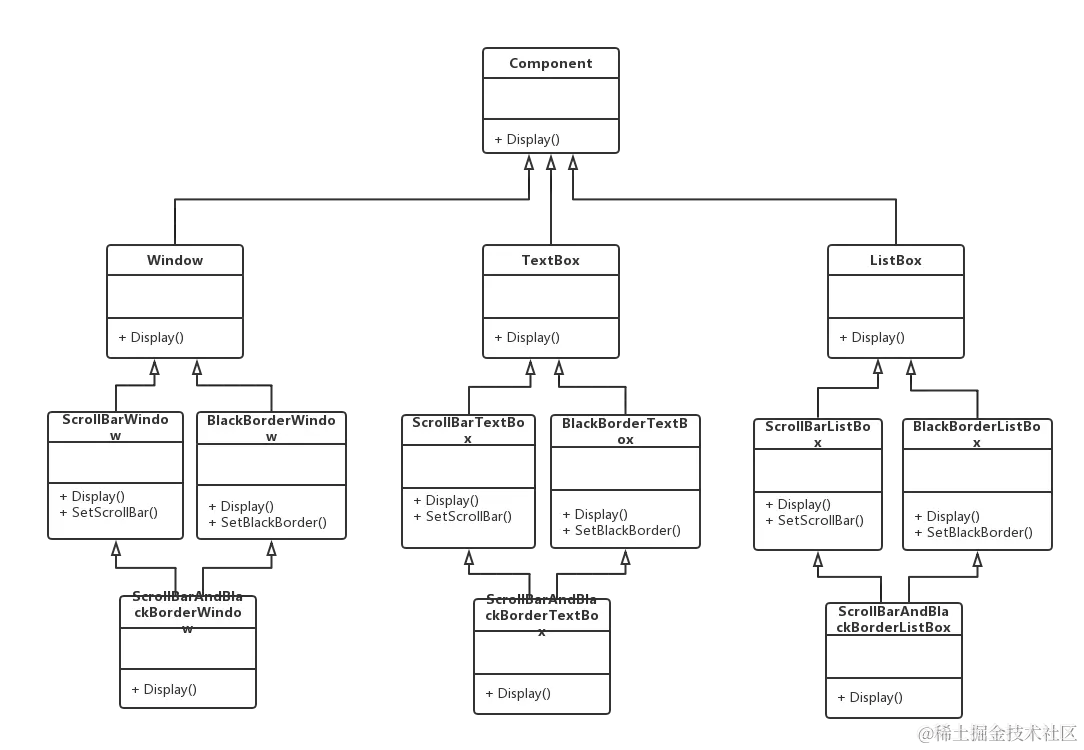 背景: M公司开发部基于OO技术开发了一套图形界面构件库Visual Component,该构件库提供了大量的基本构件,如窗体、文本框、列表框等等,由于在使用该构件库时,用户经常要求定制一些特殊的显示效果,例如带滚动条的窗体,带黑色边框的文本框,即带滚动条又带黑色边框的列表框等,因此经常需要对该构件库进行扩展以增强其功能,如下图所示:
