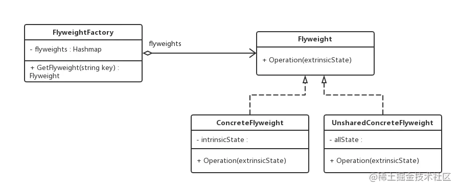 (3)UnsharedConcreteFlyweight(非共享具体享元类):并不是所有的抽象享元类的子类都需要被共享,不能被共享的子类可设计为费共享具体享元类。