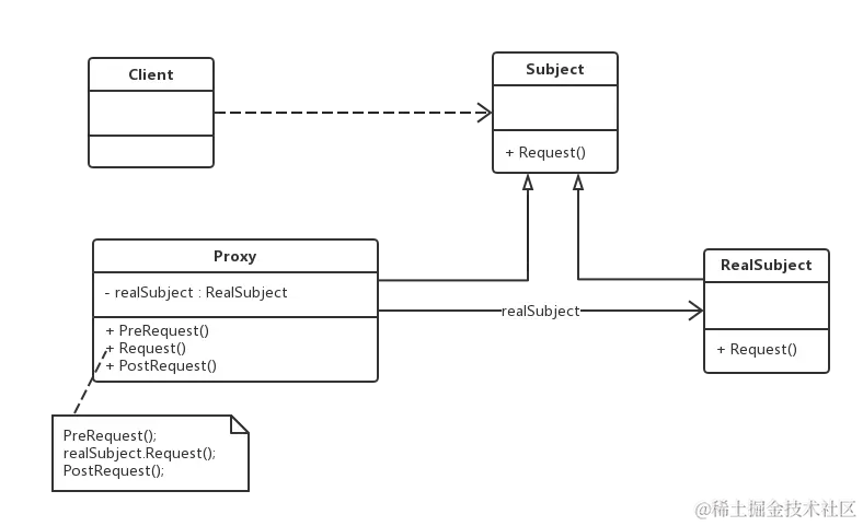 (1)Subject(抽象主题角色):声明真实主题和代理主题的共同接口,使得在任何使用真实主题的地方都可以使用代理主题。