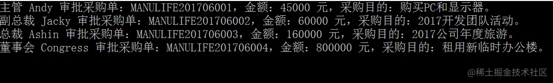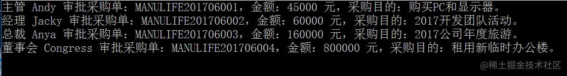 Console.WriteLine("经理 {0} 审批采购单:{1},金额:{2} 元,采购目的:{3}。",