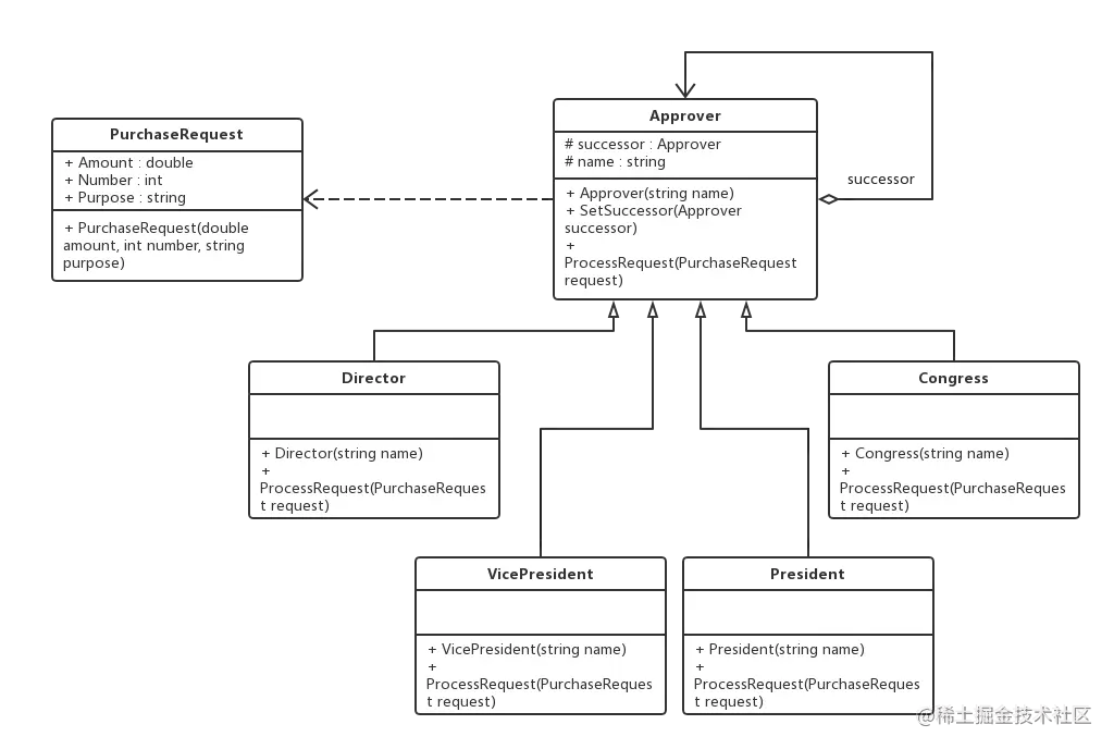 其中,抽象类Approver充当抽象处理类,Director, VicePresident, President以及Congress 充当具体处理者,PurchaseRequest充当请求类。