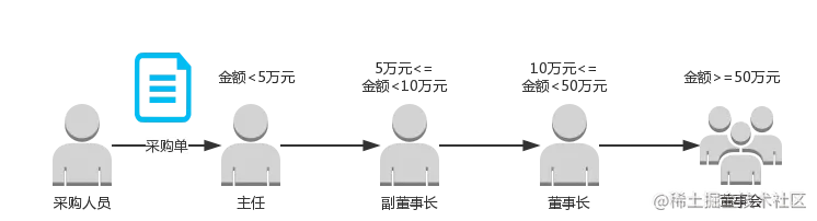 需求背景: M公司承接了某企业SCM(Supply Chain Management,供应链管理)系统的开发任务,其中包含一个采购审批子系统。该企业的采购审批是分级进行的,即根据采购金额的不同由不同层次的主管人员来审批:主任可以审批5万元以下(不包括5万)的采购单,副董事长可以审批5万~10万(不包括10万)的采购单,50万元以及以上的采购单就需要开董事会讨论决定,如下图所示: