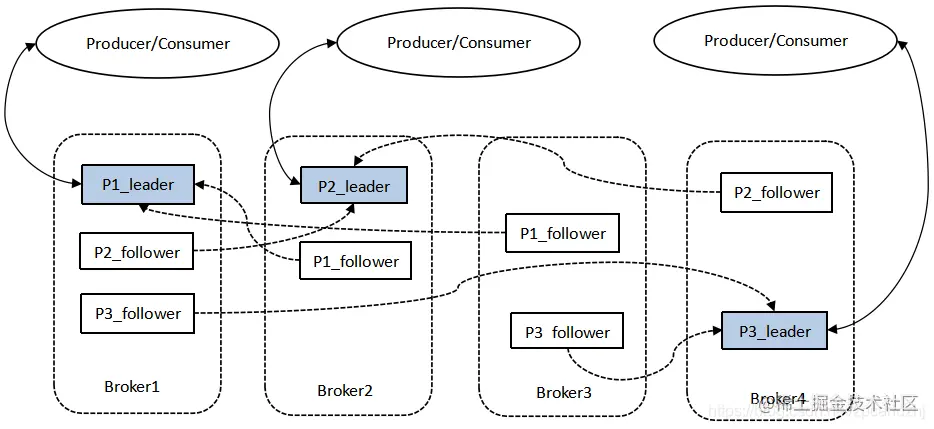 - Replica:副本存在于broker中,当leader副本出现故障时,从follower副本中重新选择新的leader副本对外提供读写工作。kafka通过多副本机制,实现了故障的自动转移。当kafka集群中某个broker挂掉时,副本机制保证该节点上的partition数据不丢失,仍然能保证kafka服务能使用